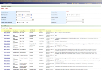 The screen provides various search fields for finding past patient cases and incidents. By using the search fields, you are able to refine the number of case returned by the search and also sort the results.